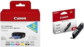 Canon PGI-550/CLI-551 Cartouches PGBK/C/M/Y/BK/GY Multipack Noire Pigmenté, Cyan, Magenta, Jaune, Noir, Gris (Multipack Plastique) & CLI-551XL Cartouche GY Gris XL (Emballage Carton)